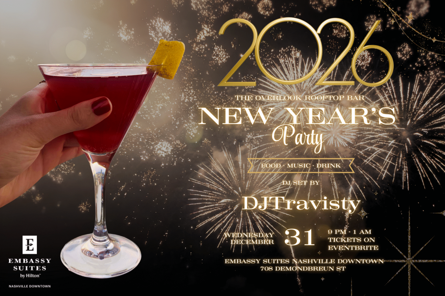 Celebrate New Year’s Eve 2025-2026 at The Overlook Rooftop at Embassy Suites Nashville Downtown on Wednesday, December 31, 2025, from 9:00pm to 1:00am. The evening will feature a live DJ set by DJ Travisty, festive bites, two complimentary drink tickets, and a champagne toast at midnight during the sparking balloon drop that fills the rooftop with NYE magic. Guests must be 21 or older to attend.