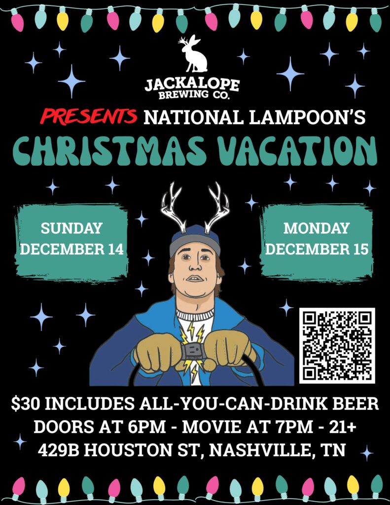 Jackalope’s Annual Christmas Vacation is Sunday and Monday, December 14-15, 2025, at Jackalope Brewing Company. This event is in collaboration with the Nashville Film Festival. Guests can expect showings of National Lampoon’s Christmas Vacation, beer wristbands for $30, freshly popped popcorn, and more. Doors open at 6:00pm and the movie begins at 7:00pm. Admission is 21 and over only.
