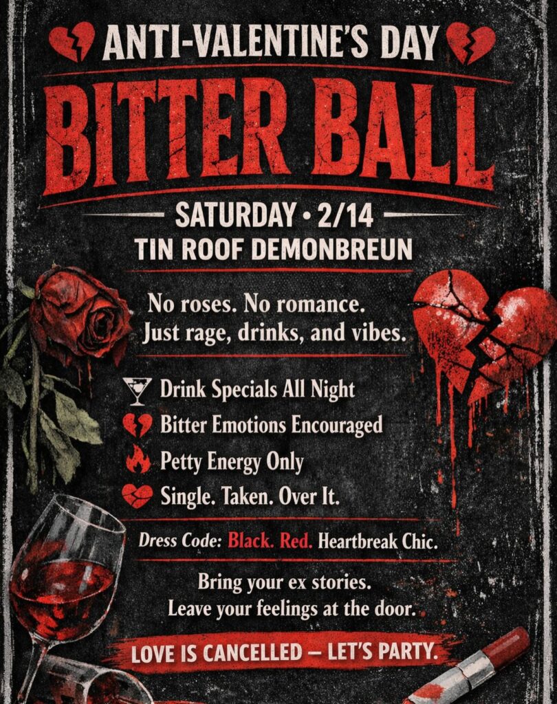 The annual Bitter Ball, Nashville’s Biggest Anti-Valentine’s Day Party, is on Saturday, February 14, 2026, at Tin Roof on Demonbreun. This event is geared towards Nashville singles without V-day plans. Attendees can expect festive drink specials, DJs, and dancing. There is no cover for entry. Admission is 21 and over only.