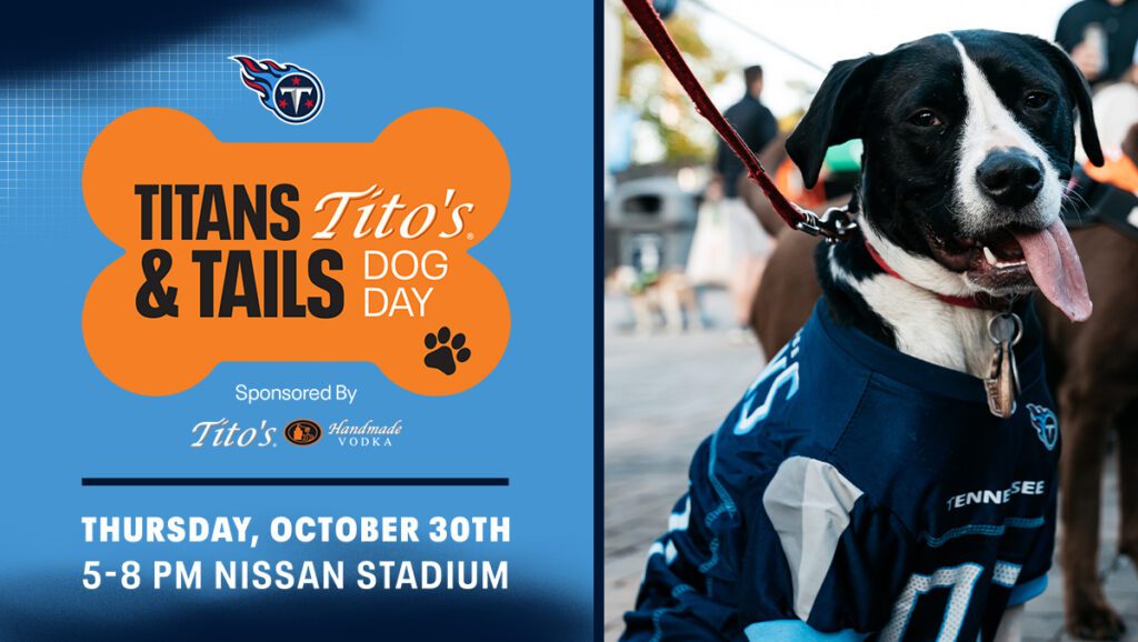 The fourth annual Titans, Tito’s, and Tails Dog Day is Thursday, October 30, 2025, from 5:00pm to 8:00pm at Nissan Stadium. Expect a Halloween-themed event for dog lovers and their pups, featuring specialty cocktails from Tito’s Handmade Vodka, food trucks, free treats (for humans and pups), activities, games, and vendors. Attendees are encouraged to dress in their best costumes to participate in the Halloween Costume Contests—including Best Human & Dog Costume Combo, Best Group Costume, and Most Creative—for a chance to win prizes. Tickets are $5.99 and admission is open to all ages. 100% of proceeds will be donated to Old Friends Senior Dog Sanctuary and New Leash on Life.