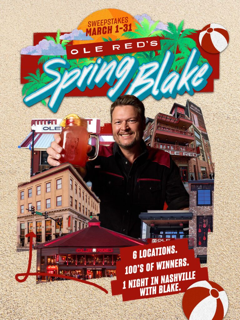 The Spring Blake at Ole Red: Private Blake Shelton Concert Sweepstakes will take place from Sunday, March 1, 2026, through Tuesday, March 31, 2026. To try and score an invite to the private concert taking place on Wednesday, April 29, 2026, fans must visit Nashville’s Ole Red location on Broadway during the sweepstakes time frame. To join the sweepstakes, scan the QR code at the table and enter. Multiple visits equal multiple entries! While there, enjoy some festive beverages and check out the new Spring Blake tees in the retail shop.