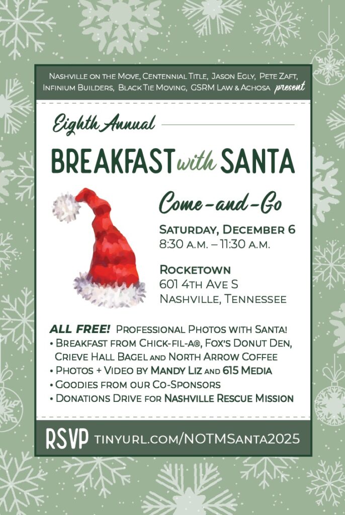 Breakfast with Santa at Rocketown is Saturday, December 6, 2025, from 8:30am to 11:30am. Expect a delicious breakfast and professional photos with Santa! Breakfast options will be from Chick-fil-A, Fox’s Donut Den, Crieve Hall Bagel, North Arrow Coffee, and others. This event is free admission and open to all ages.
