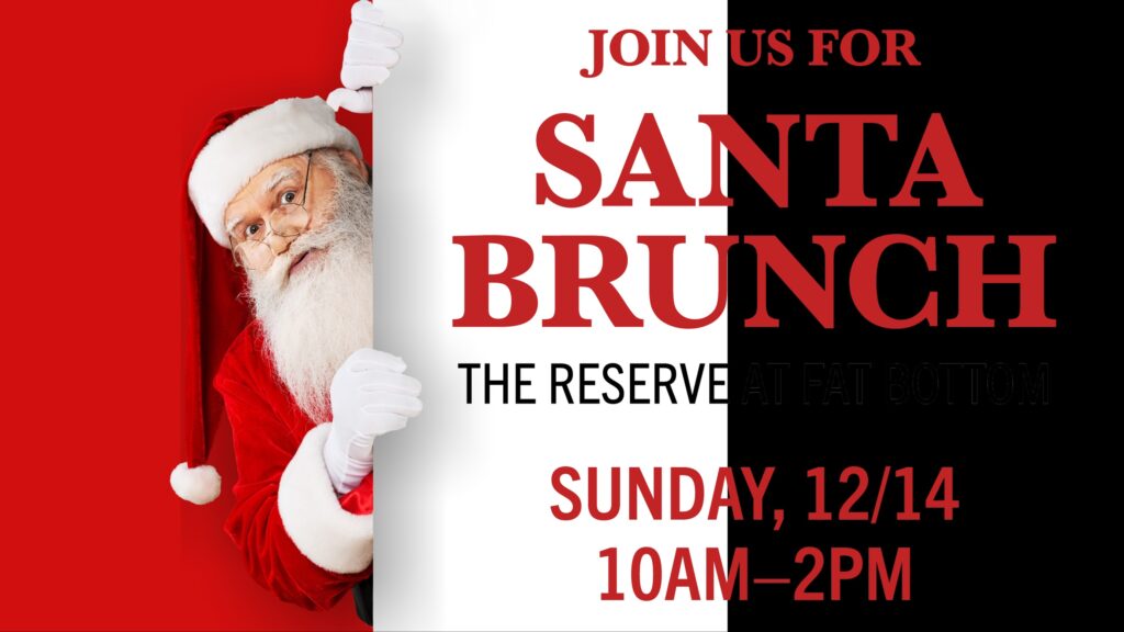 Santa Brunch at The Reserve at Fat Bottom is on Sunday, December 14, 2025, from 10:00am to 2:00pm. This event will feature a brunch buffet, photos with Santa, holiday crafts for kids, and specialty cocktails for adults. Pricing varies based on age.