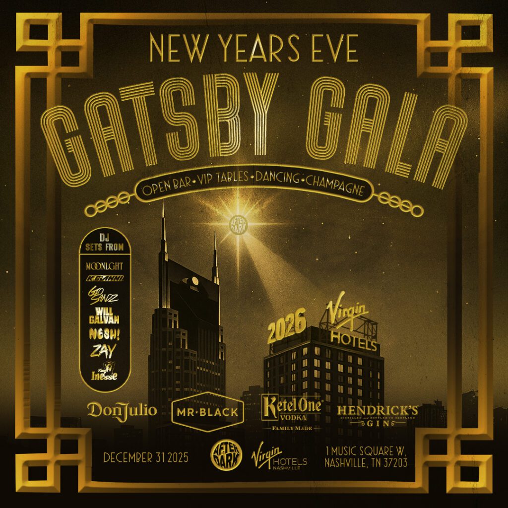 After Dark presents the 4th annual New Year’s Eve Gatsby Gala at Virgin Hotels Nashville on Wednesday, December 31, 2025, from 9:00pm to 2:00am. This is one of Nashville’s biggest New Year’s Eve celebrations spanning four floors! VIP guests can enjoy an exclusive early admission at 8:00pm as well as access to the speakeasy, and all guests can expect a fully immersive hotel experience including “The Gatsby Lounge” on the first floor at Commons Club, “Gatsby Ballroom” on the 2nd floor, and “Gatsby Rooftop” at The Pool Club with DJs, city lights, live performers, festive food buffets, and more. Roaring 20s attire is encouraged, and the dress code is strictly enforced. Ticket prices start at $175 and include an open bar. Admission is 21 and over only. Email vip.nashville@virginhotels.com for more information about VIP access.
