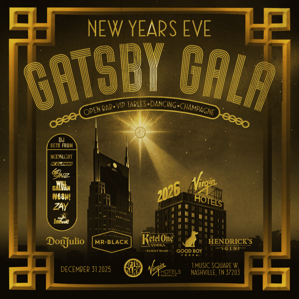 After Dark presents the 4th annual New Year’s Eve Gatsby Gala at Virgin Hotels Nashville on Wednesday, December 31, 2025, from 9:00pm to 2:00am. This is one of Nashville’s biggest New Year’s Eve celebrations spanning four floors! VIP guests can enjoy an exclusive early admission at 8:00pm as well as access to the speakeasy, and all guests can expect a fully immersive hotel experience including “The Gatsby Lounge” on the first floor at Commons Club, “Gatsby Ballroom” on the 2nd floor, and “Gatsby Rooftop” at The Pool Club with DJs, city lights, live performers, festive food buffets, and more. Roaring 20s attire is encouraged, and the dress code is strictly enforced. Ticket prices start at $175 and include an open bar. Admission is 21 and over only. Email vip.nashville@virginhotels.com for more information about VIP access.