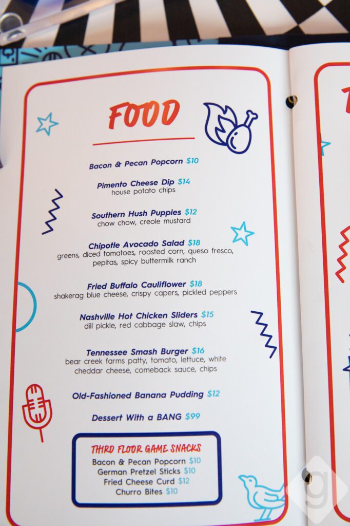 The food menu is limited but mighty, with options like Nashville Hot Chicken Sliders, a Tennessee Smash Burger, Southern Hush Puppies, and gaming snacks like German Pretzel Sticks and Fried Cheese Curds.