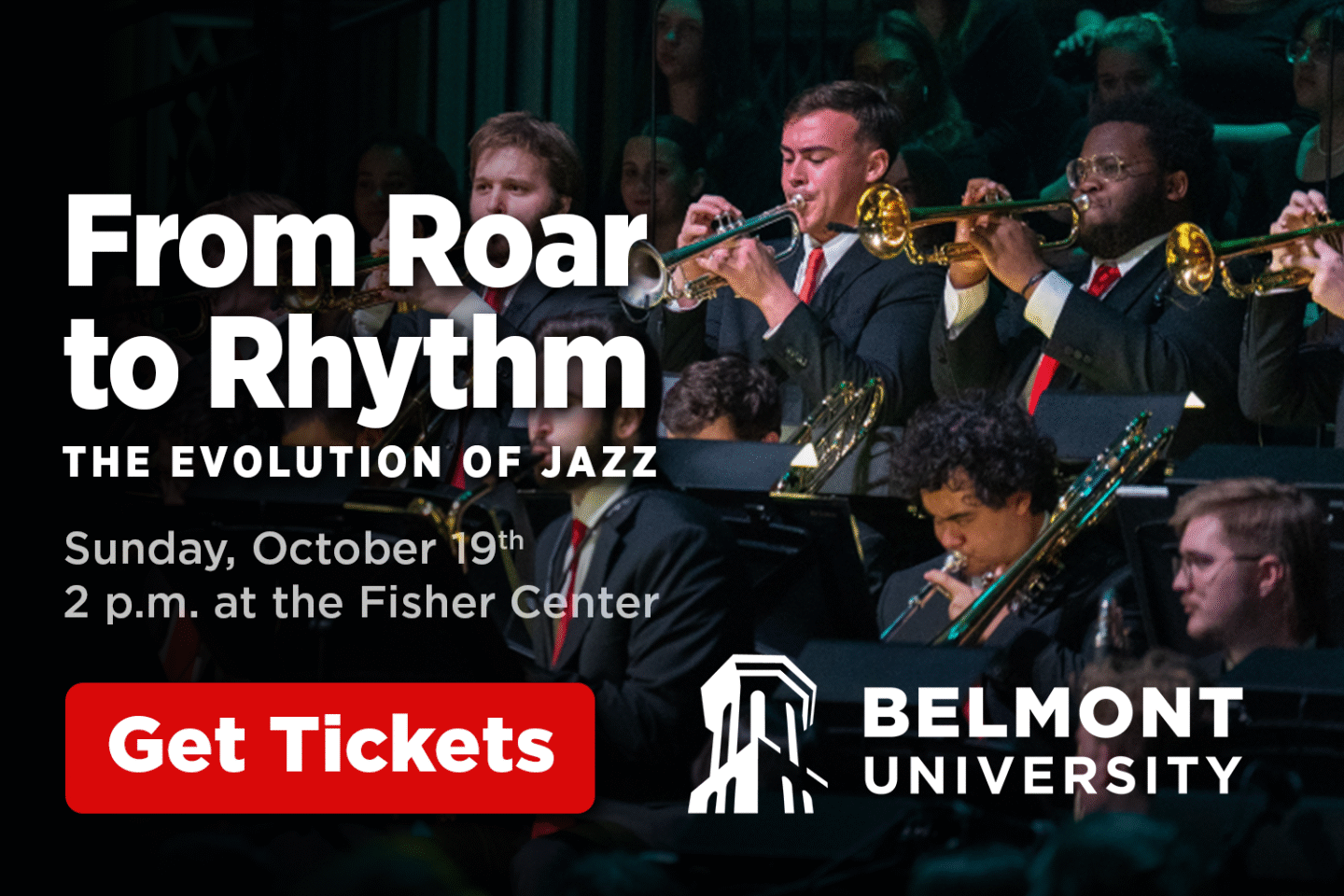 From Roar to Rhythm: The Evolution of Jazz is Sunday, October 19, 2025, at 2:00pm at Belmont University’s The Fisher Center. Expect a live performance by the Belmont Jazz Band showcasing a century of sound, including swing, big band classics, and modern jazz. Experience an unforgettable musical journey of jazz’s past, present, and future. Tickets start at $22. This event is open to the public.