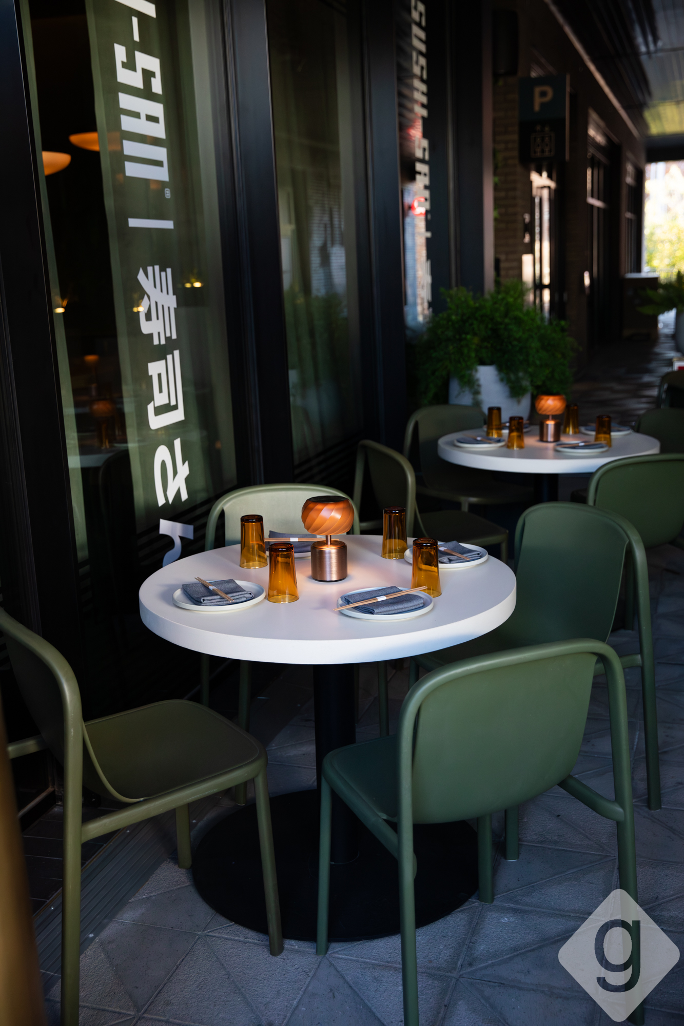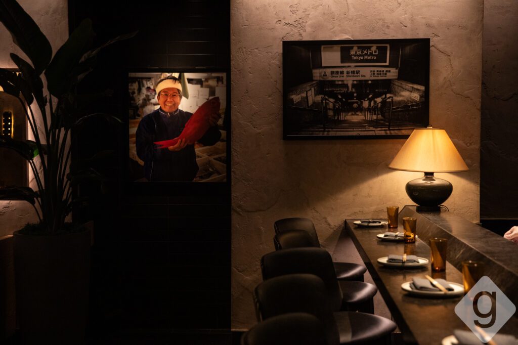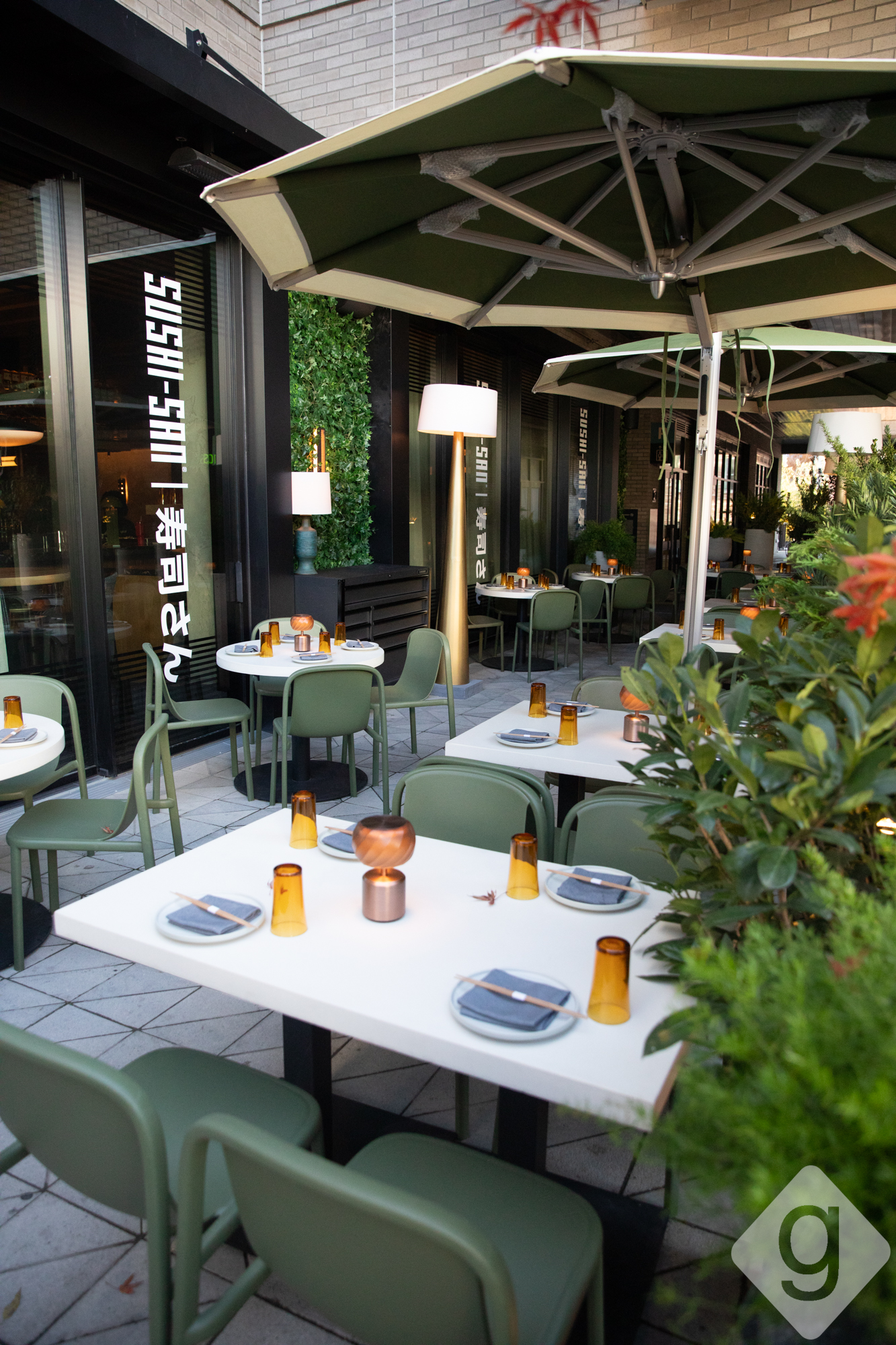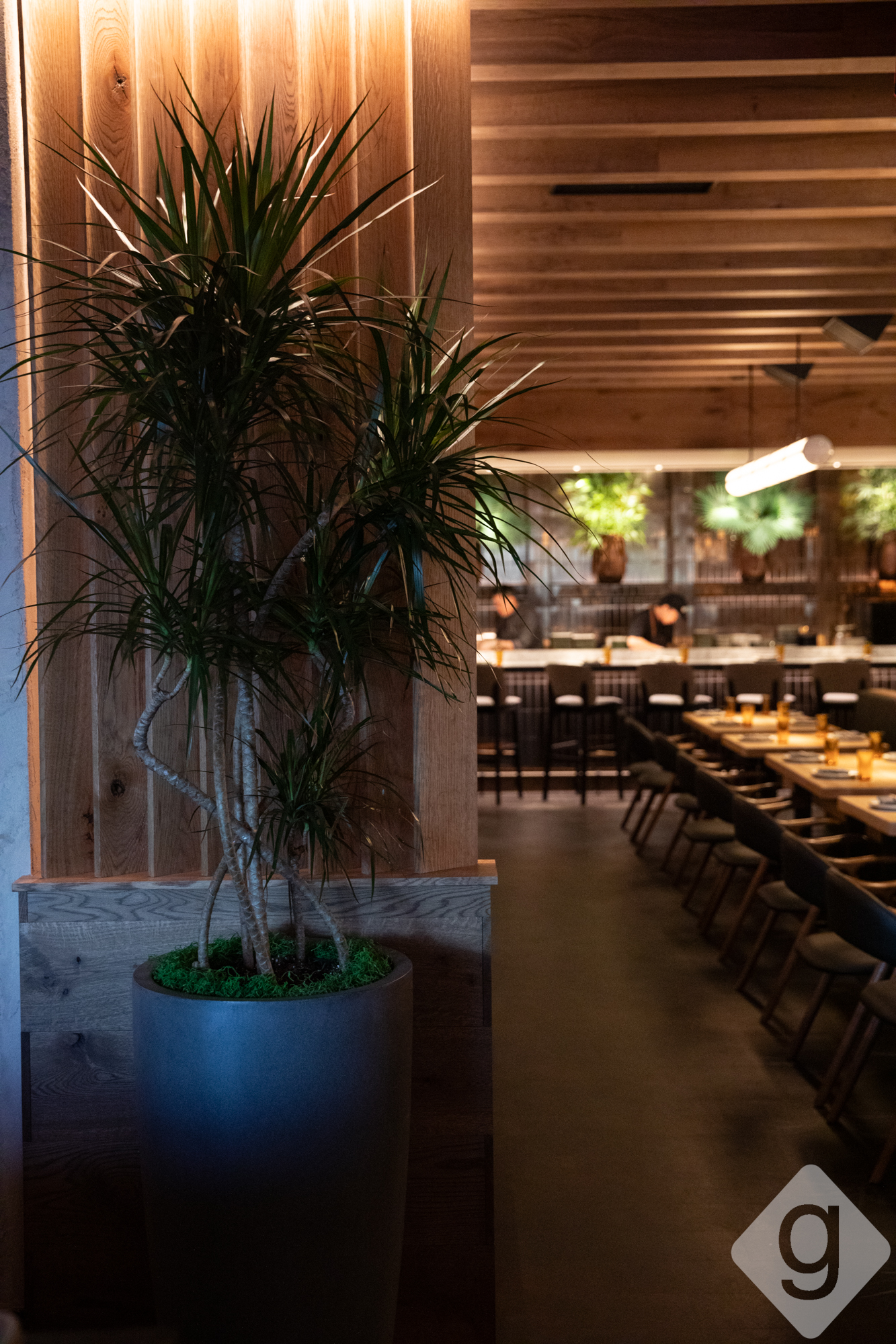 Sushi-san’s interior offers space for up to 158 guests. The atmosphere is dimly lit with a 24-seat bar and lounge area, booths, tables, and a 12-seat private dining room. Get a seat at the sushi counter to watch the mastery of the sushi chefs. Japanese-inspired art and decor are featured throughout alongside plants and green tones to give a natural and earthy vibe.
