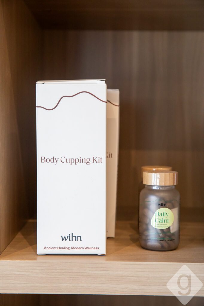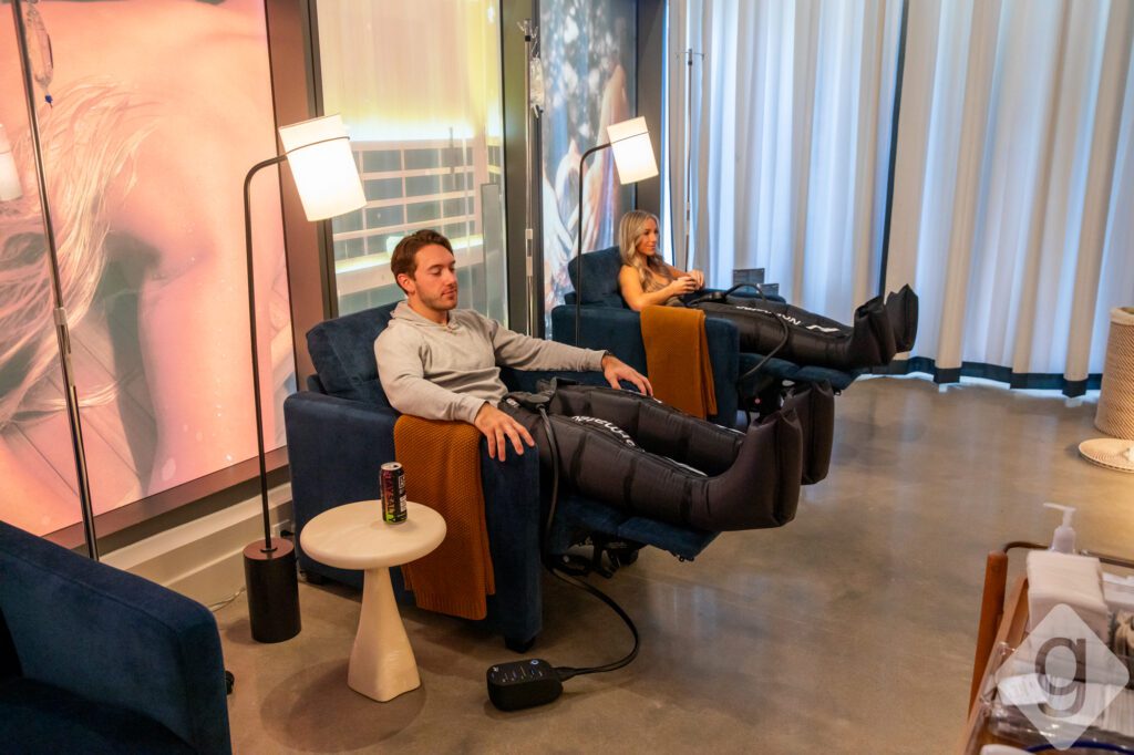 In the front boutique, guests can shop for a variety of wellness products, including massage guns, vitamins, cold drinks like cans of LMNT, body cupping kits, and more.
