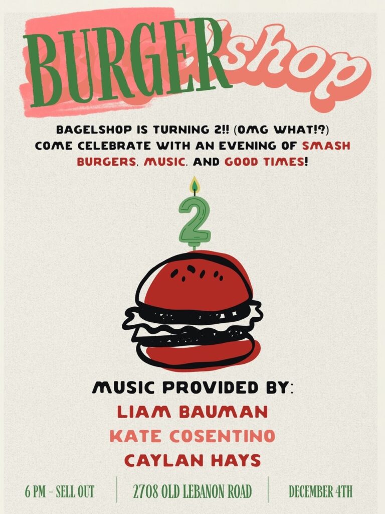 The Bagelshop Turns 2: Burgershop Night is Thursday, December 4, 2025, from 6:00pm to 8:00pm at Bagelshop in Donelson. For one night only, Bagelshop will transform into “Burgershop.” Attendees can expect an evening of smashburgers, good vibes, and live music. Admission is free, and all ages are welcome.