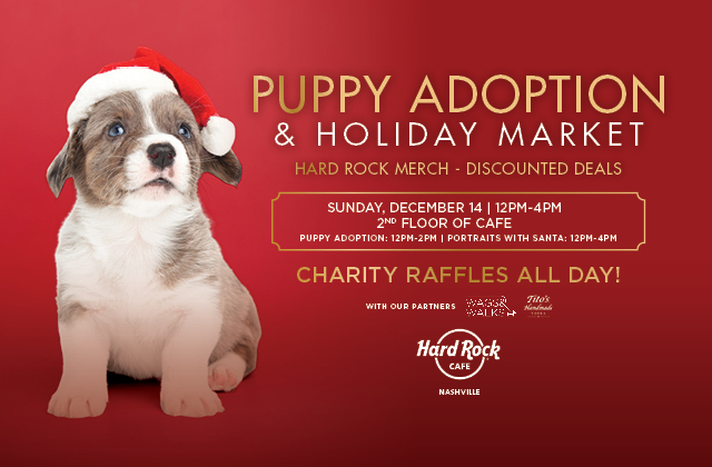 The Puppy Adoption & Holiday Market at Hard Rock Cafe will take place on Sunday, December 14, 2025, from noon to 4:00pm. This festive, family-friendly event will feature discounted deals on Hard Rock merchandise, photos with Santa, adoptable pups, charity raffles, and more. Admission is free and open to all ages.