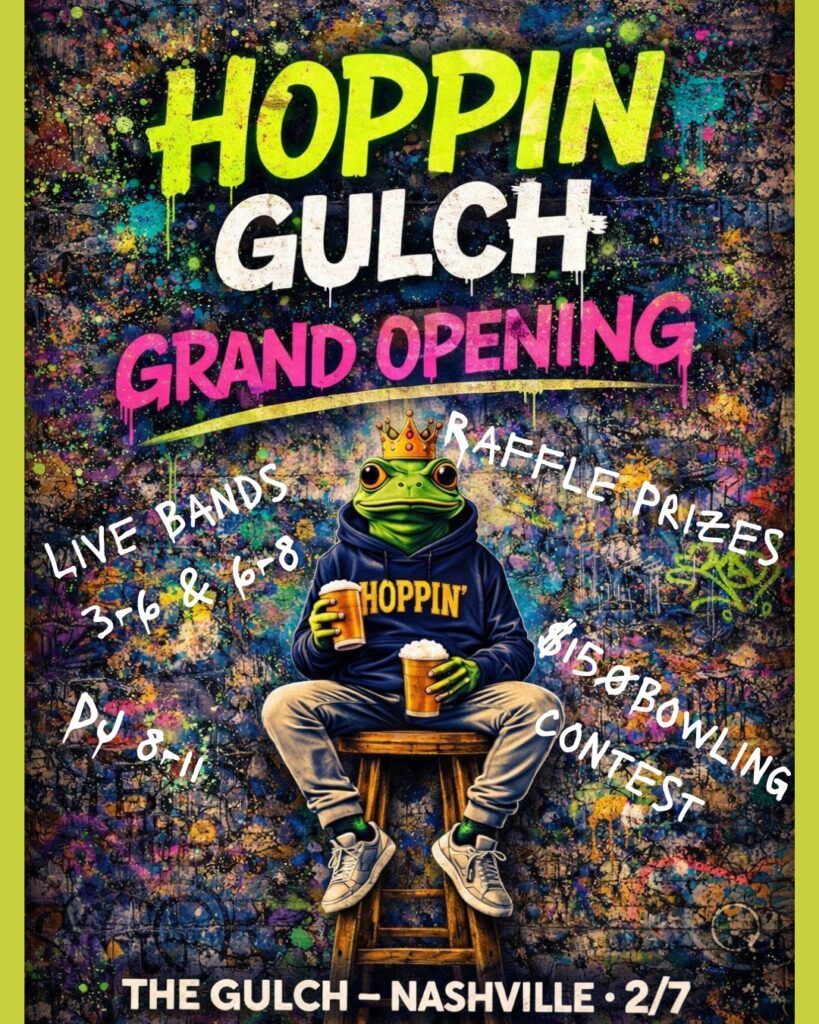The Hoppin’ Gulch Grand Opening Party is taking place on Saturday, February 7, 2026, from noon to midnight. This celebratory event will feature live music performances (3:00pm to 8:00pm), DJs (8:00pm to 11:00pm), raffle prizes (Predators tickets and a Nespresso), and a $150 gift card prize to the highest score for Duckpin bowling. Admission is free.