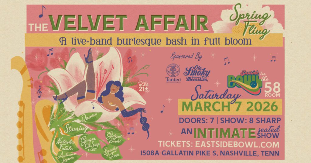The Velvet Affair: Spring Fling is on Saturday, March 7, 2026, at Eastside Bowl. This intimate, seated burlesque experience will feature sultry sax, dazzling performers, and slow-burning tease. Doors open at 7:00pm and the show begins at 8:00pm. General admission tickets are $35.31, and VIP tickets are $50.77. Guests must be 21 and over only.