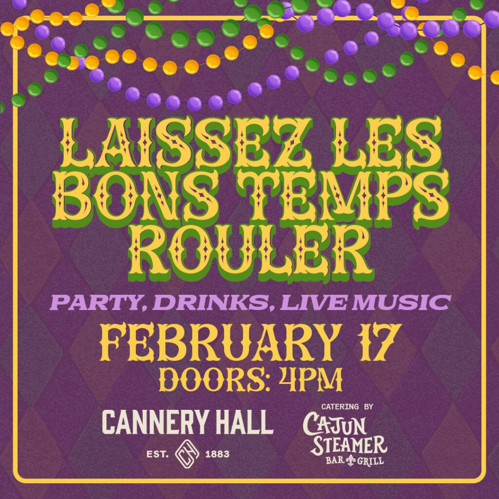Celebrate Fat Tuesday during Laissez Les Bons Temps Rouler on Tuesday, February 17, 2026, starting at 4:00pm at Cannery Hall. This festive party will feature a crawfish boil, happy hour discounts, live entertainment from Chief Smiley Ricks and The C-Town Special starting at 7:30pm, and catering by Cajun Steamer Bar & Grill. Happy hour specials from 4:00pm to 6:00pm include select $8 cocktails and $4 shots. Expect drink options like Hurricanes, Frozen Hand Grenades, and Sazerac. Admission is FREE, but upgrade options are available. All ages are welcome, but you must be 21 or older to drink.