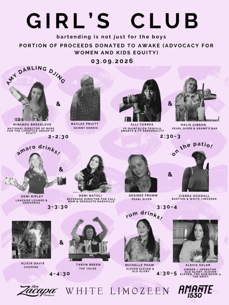 Girl’s Club at White Limozeen is taking place on Monday, March 9, 2026, beginning at 2:00pm. This event will celebrate Women’s Month with twelve of Nashville’s top female bartenders. Guests can expect classic rum and amaro cocktails, vibrant energy, and a portion of proceeds benefitting AWAKE Tennessee. Admission is free. RSVP here.