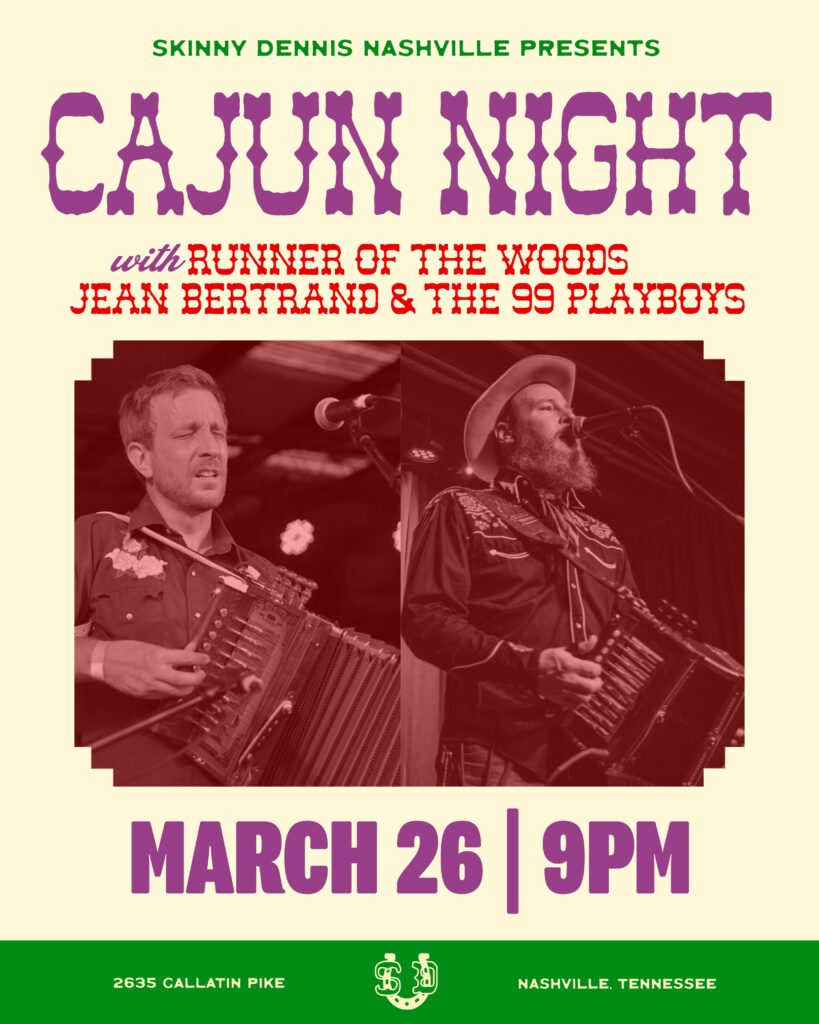 Cajun Night at Skinny Dennis will take place on Thursday, March 26, 2026, beginning at 9:00pm. This event will feature live performances by Nashville’s Cajun and honky-tonk troubadours, Runner of the Woods, along with Jean Bertrand & the 99 Playboys, coming all the way from Lafayette, Louisiana. Admission is 21 and over only.