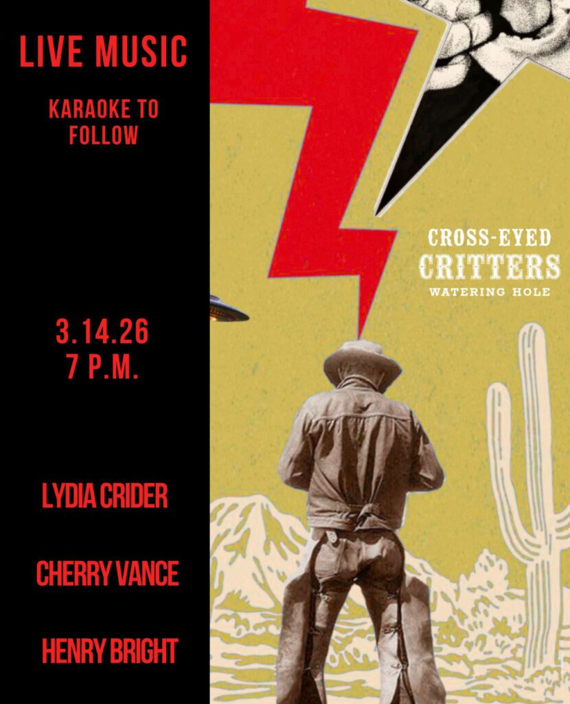 Enjoy a Live Music Showcase at Cross-Eyed Critters on Saturday, March 14, 2026. Guests can expect a live music showcase featuring Lydia Crider, Cherry Vance, and Henry Bright. Karaoke will follow! Doors open at 7:00pm. Admission is free and limited to ages 21 and over.