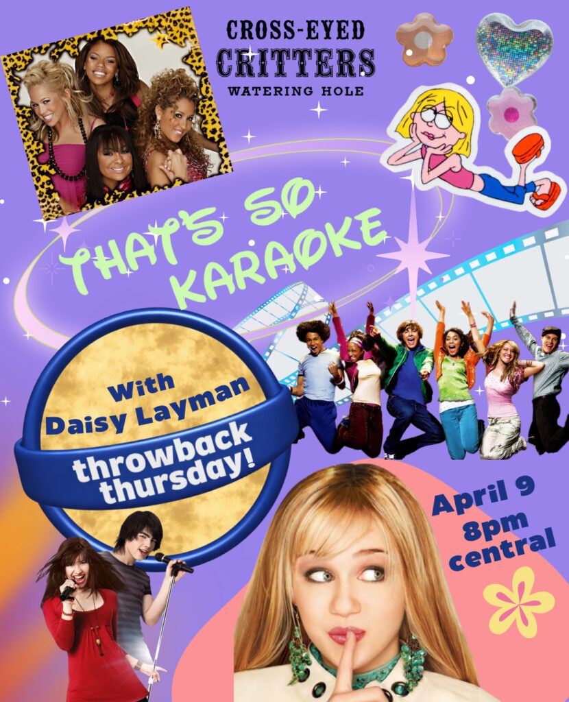 In need of a fun, nostalgic escape? Check out Throwback Thursday Karaoke at Cross-Eyed Critters with Daisy Laymen taking place on Thursday, April 9, 2026, at 8:00pm. Attendees can expect to sing all their favorite hits! Admission is free and 21 and over only. RSVP here.