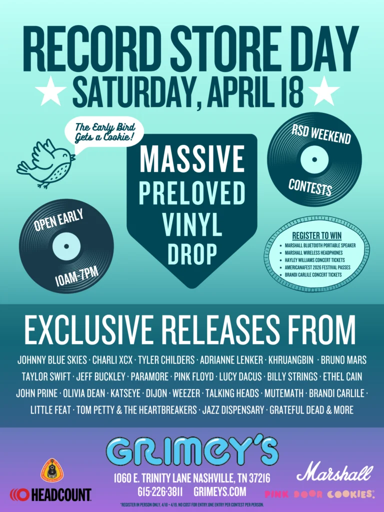 Celebrate Record Store Day at Grimey’s on Saturday, April 18, 2026, from 10:00am to 7:00pm. This annual event will feature a massive pre-loved vinyl drop, exclusive releases, cookies from Pink Door Cookies, awesome giveaways, and more. Admission is free and open to all ages.