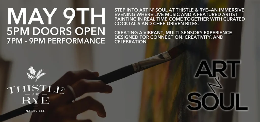 Art N’ Soul will take place on Saturday, May 9, 2026, at Thistle and Rye (located on the 3rd floor of Conrad Nashville). Attendees can expect an intimate live music and art experience featuring two female artists performing acoustic sets while a painter interprets one song from each performance live on canvas. The artwork is later auctioned to support women-focused charities. There will also be curated cocktails and chef-driven bites. Tickets are $23.18 per person and include a welcome cocktail or glass of bubbles. Doors open at 5:00pm, and the performance will take place from 7:00pm to 9:00pm.