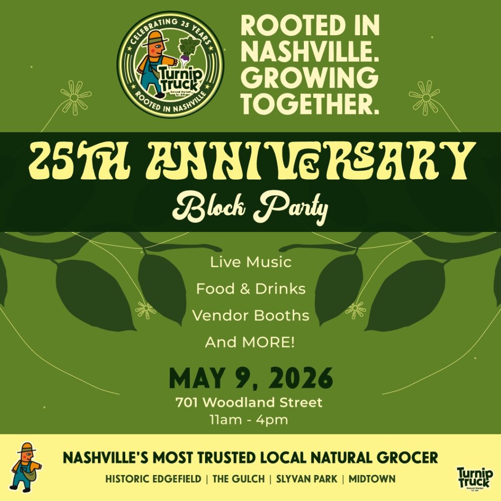 Turnip Truck’s 25th Birthday Block Party will take place on Saturday, May 9, 2026, from 11:00am to 4:00pm at their East Nashville store’s parking lot. This celebration will feature samples from local vendors, a special block party menu of food and beverages, live music performances, and steep discounts on premium products. Admission is free and open to all ages.