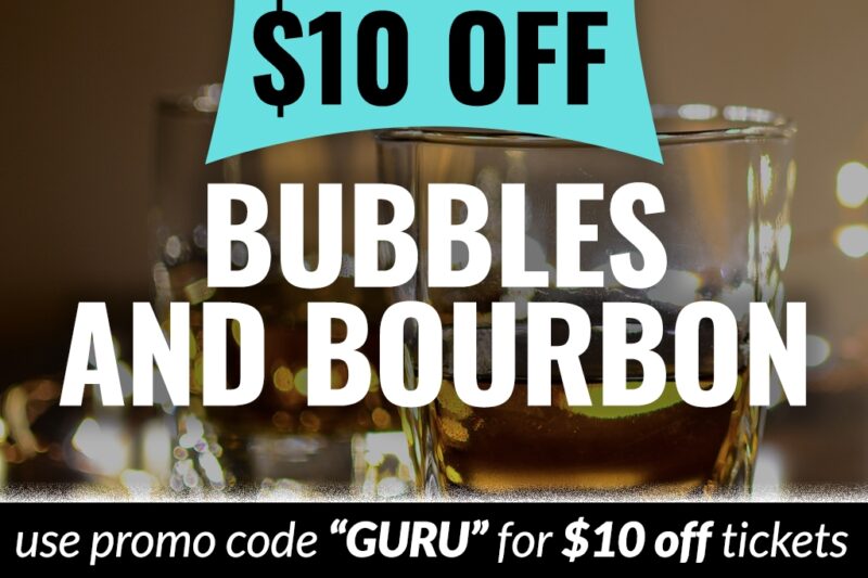 Use promo code GURU to get $10 OFF tickets to Bubbles and Bourbon on Saturday, February 21, 2026!